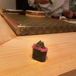 【鮨 尚充】 ・東京 :中目黒駅から徒歩10分 五年半ぶりに「鮨 尚充」さんへ訪問! 久しぶりにいただいたお寿司やおつまみは相変わらずどれも最高峰の逸品ばかりで五感をフル活用し楽しむ事ができました(゜ρ゜) そして序盤に同伴者のKENタロウさんから誕生日祝いとしてシャンパンをごちそうになり本当にありがとうございます!! 本マグロもシャリも最高♪ エルメスマグロだと思っていたネギトロの「H」文字は僕がこないだ誕生日だったと伝えたら「HAPPY BIRTHDAYのHです」と言われ照れます(笑) ちなみにエルメスマグロを載せるエルメスのお皿が割れて今回は違うお皿での提供になったようです。 そしてすべて美味しかったのですがやはり尚充さんといえば生雲丹!! 一箱9万円という「はだての生うに」のムラサキウニはもちろん美味しいのですが、尚充さんの独自ブランドで一箱7万5千円らしい「川勝特上うに」の赤雲丹も格別でしたよ★☆ 新イクラにキロ12,000円もする日本最高級の鹿児島県出水産のアジも握りでいただけたりとまさに天国!! また次回の予約もとれるので楽しみが1つ増えました♪ 次回は今回と一緒の四名席にしようと思います(^-^) 素晴らしいエンターテイメント寿司ごちそうさまでした~ ◇おまかせ◆ ・マツカワカレイ ・真牡蠣 ・しじみ汁 ・毛蟹 ・ノドグロ (握り) ・新烏賊の下足 ・新烏賊と熊本県天草産の赤雲丹 (握り) ・マグロカマと東欧産白トリュフ ・赤身漬け (握り) ・黒あわび~肝ソース ・真蛸~柚子胡椒 ・太刀魚 ・小柱 (軍艦) ・雲丹佃煮 ・中トロ (握り) ・大トロ (握り) ・枝豆 ・トロタク~キャビア (軍艦) ・バチコとコノワタの茶碗蒸し ・新イクラ (軍艦) ・コハダ (握り) ・車海老 (握り) ・カラスミ餅 ・水茄子~オリーブオイル、塩 ・メヒカリ ・あん肝と西瓜の奈良漬け巻き ・石垣貝 ・アジ (握り、キロ12,000円の日本最高級の鹿児島県出水産) ・川勝特上うに (尚充独自ブランド、兵庫県淡路島産の赤雲丹、一箱7万5千円) ・はだての生うに (ムラサキウニ、一箱9万円) ・穴キュウ巻き ・玉 ◇追加◆ ・NV ブリュット ドゥラモット (KENタロウさんからのプレゼント) ・日本酒を5銘柄