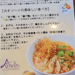 カオソーイ目当てで初訪問。 ドアを開けると「サワディカップ コンニチワ〜」という声で出迎えられます。この時点でなんとなく異国感が漂う。とてもいい感じ。 11:30の開店から程なくして入店したが、すでに2組の客が。その後も次々とやってきて、12時前には満席に。聞いてた以上の人気ぶりです。 カオソーイとカオマンガイのランチセットをオーダー。5分ほどで提供して頂いた。 カオソーイはココナッツミルクがほどよく効いててマイルド。普通の麺とパリパリ麺の2種類入ってるのも楽しい。薬味が添えられてるのでそれらを入れてもそのまま食べてもいい。特筆すべきは何やら酸っぱそうな小さい柑橘系の何か。これを搾り垂らすとスープがグッとさわやかに。パクチーと相まってタイ料理感がさらに高まります。 ミニカオマンガイも文句なしに美味しい。柏でカオマンガイといえばガッチキが一番に浮かぶが、ここもまったく引けを取らない。タイ米だからこそカオマンガイは美味しい。いい店はそれを教えてくれる。 デザートのタピオカミルクにはマンゴーも入ってる。非常に美味。これが食事の満足度をさらにグッと上げてくれる。 本当に良いお店でした。隣の人が頼んでたレッドカレーつけ麺もすごく美味しそうでした。 再訪は確実です。