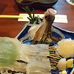 ウニ刺しと活イカ刺しをオーダー お通しがカニという点も好印象でです。 接客も丁寧で嬉しいです。 季節柄スルメイカですが、目と脚の部分はキラキラしながら暫く動いていていました。 こちらはボイルまたは刺身にしていただけます。 胴の部分は既に身の色が白く活イカの特徴的な透明感が全くなかったので、部位の全てが活イカではないのかもしれません。 ウニ刺しは口にしていませんが、同席者は満足した様子です。