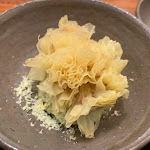 【究極に手間がかけられ、旬を大切にした上質な日本料理】 一度訪ねてみたかった六本木「明寂」へ。 「岩手の久慈の松茸のお椀」…上に切り立ての松茸、下に松茸の水煮…香りをまず楽しみ、次に松茸本体、最後にお出汁を楽しむ松茸三段活用。 「蟹饅頭」…殻を取ると、皮に見立てた蟹の身、中には餡子に見立てた内子と外子が入る。10月末の会食なので金沢ではまだ香箱蟹は禁漁期間中だが、これは他県のものなのでオッケーだそう。 半分はそのまま、後の半分は横に添えてある千切りのりんご、生姜と一緒に食べる。酢橘も掛けられていて蟹酢的な使われ方で甘みとほのかな酸味と辛味で面白い口中調味となる。 「ヒラメ」…ヒラメはヒラメ醤油でいただく。ヒラメ醤油とはヒラメの骨、頭から出汁をとって煮詰めたものに醤油を加えて作ったマニアックな一品。同じく塩を入れて塩だれも用意されている。 さらに「蛸塩=タコの身から作った塩」が用意される。優しい塩味。これは蛸の身に包丁を入れて塩を入れ火を入れ乾燥、最後にパウダー状にして作ったモノ。手の込んだ、と言うかマニアックな薬味。主役の蛸にもヒラメにもちゃんと最大限に活かされるように作られたのが分かる。 「椀物=つぶ貝、ホッキ貝、下に舞茸」…昆布も鰹節も出汁には使わず、シジミだけで出汁をとっている。。 器の蓋は骨董。下の部分は無くなっていたので新しく作ったもの。五臓六腑に染み込み、しみじみ美味しい。 「サワラ」…藁で燻したサワラを皮目だけ一度カリッと焼き、魚の下には菊の花とお塩とレモンで作ったソース。皿の横には大根おろしと赤と黄色の菊の花が添えられ、口直しにこちらはいただく。とにかく身のしっとりと柔らかい食感と見事なまでの皮目のパリパリ感、香ばしさは秀逸。 「栗とズンダ」…椀の蓋を取るとキレイな花びら。これはカンナで削ったお花に見立てた栗で、それと黒枝豆のズンダを一緒に食べる。秋らしい一品であり、上品に美味。 数皿前に「滋賀県のアマゴ」の泳ぐ姿のプレゼンがあり、そしてこれが「アマゴの絹寿司」になって登場。…餌で白く育てた玉子(白身ではない)を酢飯とアマゴと共に巻いていただく。めちゃくちゃ美味しい。 「秋果和え」と名付けられた秋の果実を集めた口直し。黒イチヂク、シャインマスカット、巨峰、日本胡桃のペーストで和え、上には梨をおろしたものがシャーベット状に掛けられている。 さらにフリーズした柚子をかけてあり、全体を崩していただく。… 「月とすっぽん」…すっぽんの出汁で作った胡麻豆腐を丸くして揚げ物に。サクサクの衣もすっぽんで作ったもの。 と言うのもすっぽんの出汁に餅米を漬けて吸わせ、蒸し上げたものを何日もかけて乾かし、粉にして衣に…気の遠くなるような仕込みと作業…頭が下がる。味は割と薄口で上品。普通に話を聞かずに食べていたら、美味しくペロリと食べてしまうだけで、情報が如何に大事かわかる一品。 「上には湯葉、下には三輪そうめん」…鯛の出汁を入れたもので味わい深い。ウチで食べるとそうめんは軽食に過ぎないが、こうするとご馳走になる。 「クエの焼き物」…これも皮目がこんがりサクっとした食感。香ばしくて美味。もちろん身は柔らかくジューシー。 「松茸と牛肉」…極細に切られた松茸だからこそ香りが思いっきり立ってくる。下にある牛肉や開いた松茸を掘り出す時も思いっきり松茸の香りが立つ。出汁に松茸が落ちる時にも香り立つ。味もさる事ながら贅沢な香りを楽しむ一品…。 最後はご飯ものは「いくら、ジャコ、穴子」「蕪、隠元、南京=カボチャ」のお漬物などをオカズに炊き立て白いご飯を楽しむ。 …ふぅ、お腹いっぱい…と思っていたら、最後に追加のご飯=「玉じめ」があるというので少量追加でいただく事に。脂の乗った魚(のどぐろ的だが魚名は失念)と一緒に玉子かけご飯とかき混ぜて食べるとめちゃ美味しい。お腹に無理してでも食べてよかった。 甘味は「奉書巻き」…白隠元豆に日本独特の赤山椒を加え、モチモチで少し甘みのある生地で奉書=手紙を巻いたようにして食べる。今日二度目の巻物。普段の〆の甘味のような甘さはさほどないが上品な味わい。 「グリーンレモンのシャーベット」…口の中、スッキリとフィニッシュ。 甘味に出たのは「もちもち生地で白隠元豆の餡」を包んでいただくモノ。…上品に美味しい。甘さ控えめ。 食事の際のドリンクは「シャンパン」、「ふうりんご」と言う麦焼酎、「加賀棒茶」などをいただいた。 料理長は平成調理師専門学校から京都の料亭で修行。その後徳島の青柳を経て、赤坂の「花楽」(僕らはこの中村さんが料理長になる前に何回か行っていた店)の料理長を務めていた方。 手間暇惜しまず作られたこうした旬を楽しめる和食が食べられることは本当に幸せな事だと思う。